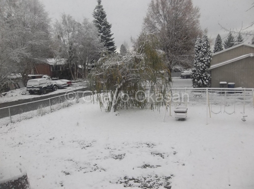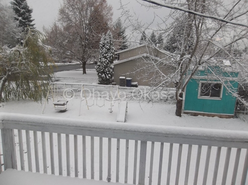 This is out our back sliding door, you can see my adorable little shed, and the poor snow covered swing set. I guess it doesn’t matter now if I buy a tarp or not for it. :/ Shoot… hopefully it holds up through the winter okay!