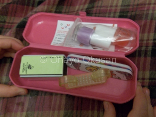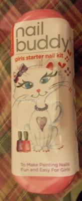 This nail buddy is a cute little set that comes with 2 nail files, 2 water based nail polishes (purple and a clear pink), a nail brush, 4 sided nail buffer, 2 sheets of nail stickers, and the adorable little case that she just loves!