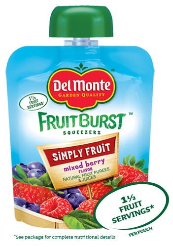 Del Monte Fruit Burst Squeezers are made in the U.S.A., Del Monte Fruit Burst™ Squeezers contain 1 ½ servings of fruit or fruit and veggies and are an excellent source of vitamins A and C. In addition, Del Monte Fruit Burst™ Squeezers contain no artificial flavors or high fructose corn syrup! Which is awesome because when it comes to fruit and veggies for my kids, I don’t want high fructose corn syrup or artificial flavors anywhere near them! Of course I try and limit their exposure to HFCS as it is.